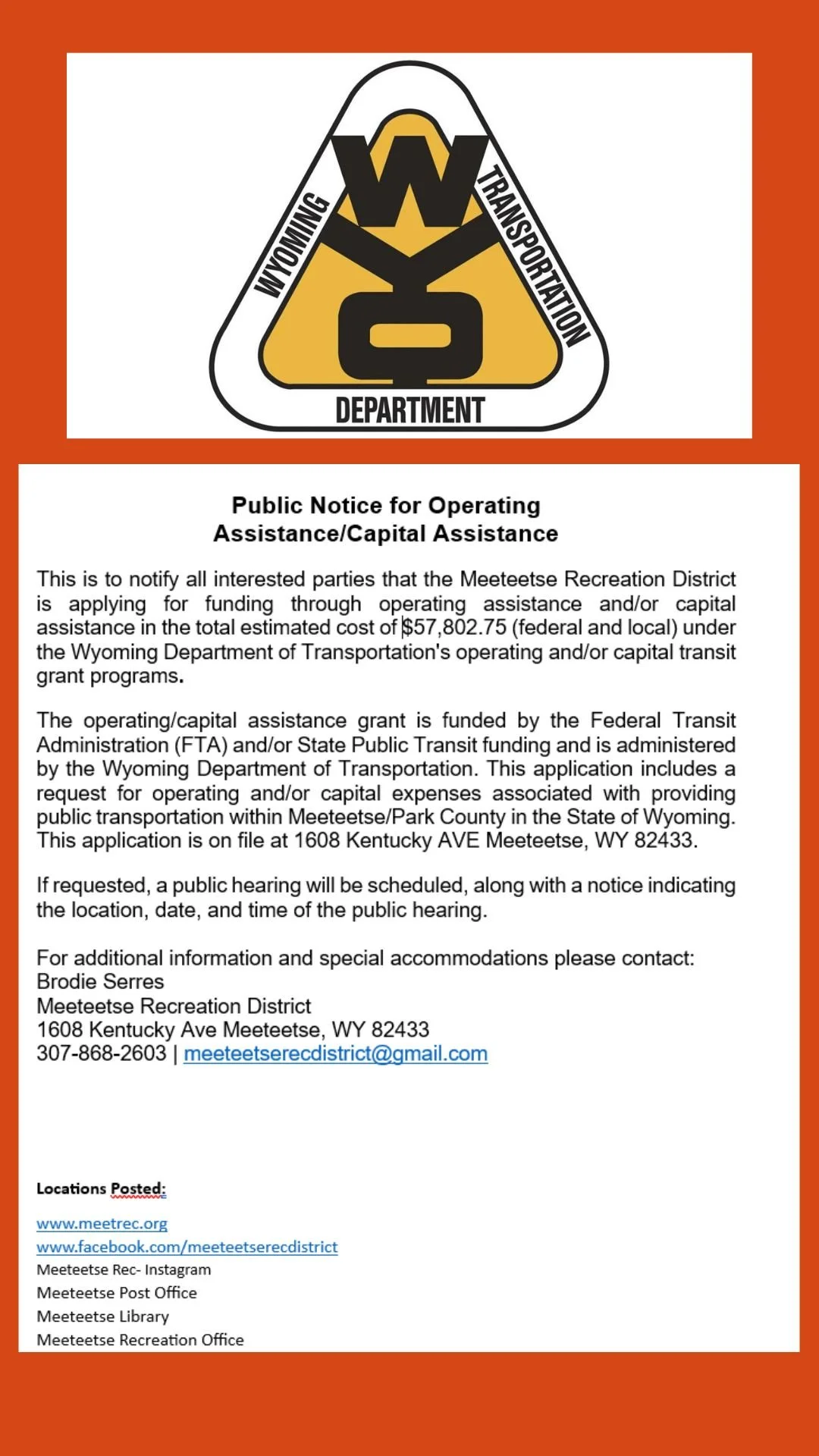 The Meeteetse Recreation District (MRD) does not unlawfully discriminate internally (in its administrative and program operations) or externally (in provision of services) on the basis of race, political orientation, religion, gender, sexual orientation, age, national origin, ethnicity, ancestry, marital status, veteran status, or mental or physical disability or any other status prohibited by applicable law, including Title VI of the Civil Rights Act of 1964, as amended. Further, under the Americans with Disabilities Act (ADA) of 1990, no entity shall discriminate against any individual with a physical or mental disability in connection with the provision of transportation services.